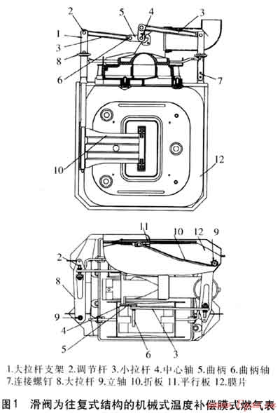 滑閥為往復式結構的機械式溫度補償膜式燃氣表是傳統(tǒng)式結構,體積較大,見圖1。
