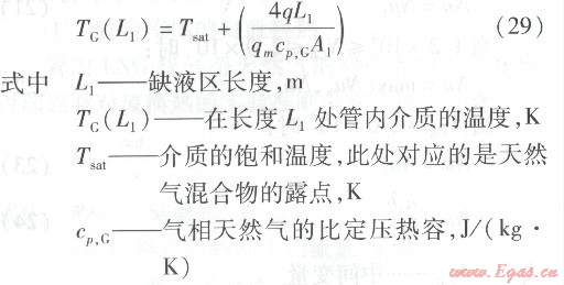 由于LNG是多元組分混合物,而混合物的沸騰換熱很復(fù)雜,因而是較難處理的,目前對二元混合物有一些沸騰傳熱系數(shù)的計(jì)算公式,但其中均含有與特定二元物質(zhì)組合有關(guān)的實(shí)驗(yàn)系數(shù),其流動換熱關(guān)系式不能直接應(yīng)用于本課題的LNG介質(zhì)。因此,本文在進(jìn)行兩相區(qū)的換熱計(jì)算時(shí),采用簡化假設(shè)。由于LNG中甲烷的摩爾分?jǐn)?shù)高達(dá)90%以上,故將此區(qū)的LNG看作甲烷。將兩相區(qū)分為流動沸騰區(qū)和缺液區(qū),在流動沸騰區(qū)溫度保持泡點(diǎn)不變,在缺液區(qū)溫度由泡點(diǎn)升高至露點(diǎn)。