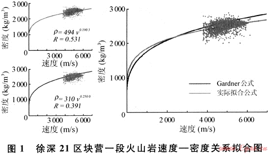 波阻抗等于密度和速度的乘積,而速度與密度存在一定的關(guān)系(如Gardner公式)[9],因此可以通過擬合密度與速度的關(guān)系,將這種關(guān)系代入波阻抗體中,分離出密度來。但不能簡單地套用Gardner公式,因為Gardner公式是國外地球物理學(xué)工作者通過對美國墨西哥灣地區(qū)淺層海相地層中巖心樣品分析得到,它更適合于沉積巖,對于徐深氣田徐深21區(qū)塊深層火山巖,應(yīng)該根據(jù)實際情況擬合適用于該區(qū)的公式模型。通過該區(qū)塊營一段火山巖地層的測井資料,得到如下公式模型(圖1):ρ=494v0.1903,相關(guān)系數(shù)為0.531。然后,通過Jason軟件Function模塊編寫函數(shù),將約束稀疏脈沖波阻抗體轉(zhuǎn)換成密度體。