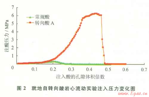巖心實(shí)驗(yàn)結(jié)果表明:就地自轉(zhuǎn)向酸注入壓力先隨注入體積的增大而增大,當(dāng)注入一定量時(shí),注入壓力急劇升高,最大增加到6.3MPa,是初始注酸壓力0.1MPa的近60倍;自轉(zhuǎn)向的注入壓力是常規(guī)酸注入壓力的20倍左右,自轉(zhuǎn)向酸具有明顯的轉(zhuǎn)向性能(圖2)。