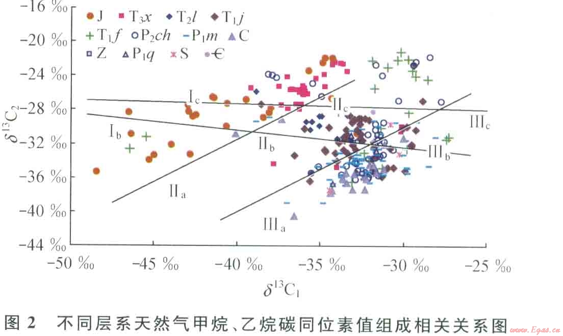 上三疊統(tǒng)天然氣ð13C1分布在-30.12%~-42.2%,ð13C2介于-29.79%~-20.19%,其ð13C2-ð13C1差值較大,在同一構(gòu)造上,上三疊統(tǒng)天然氣的ð13C1,較侏羅系的ð13C2偏重,而較下伏中、下三疊統(tǒng)、二疊系和石炭系天然氣的ð13C1偏輕,并以其乙烷碳同位素值較重與上下鄰層相區(qū)別。