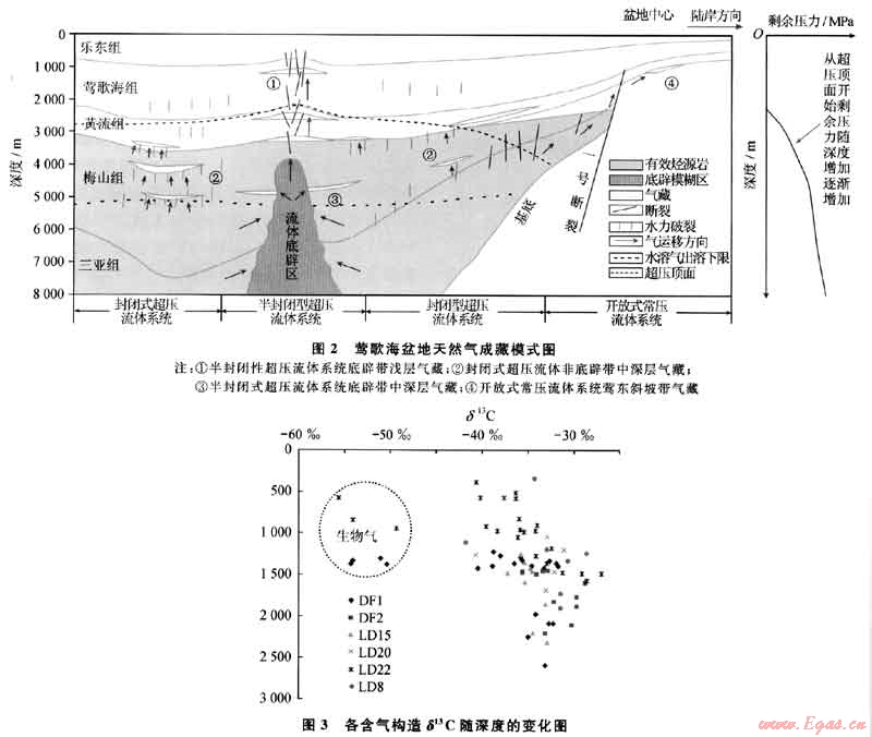 在中中新世以泥底辟為主的演化階段,地層超壓是盆地區(qū)域上壓實不均衡和三亞組大量生烴所導(dǎo)致,天然氣的有利充注部位為位于壓力過渡帶和常壓帶的中中新世背斜構(gòu)造。在晚中新世-第四紀(jì)以熱流體底辟為主的演化階段,盆地超壓體系的形成是不均衡壓實、三亞組生成的無機C02以及梅山組大量生烴所導(dǎo)致,天然氣的有利充注部位為位于壓力過渡帶和常壓帶的上新世鶯歌海組背斜構(gòu)造。