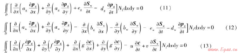 本文討論的是非穩(wěn)態(tài)的氣水滲流、氣氣擴(kuò)散問題,各參數(shù)不僅是空間域的函數(shù),而且是時(shí)間域的函數(shù),因此建立有限元方程時(shí)采用部分離散的方法[7]。對(duì)空間域的離散采用Galerkin有限元方法,對(duì)時(shí)間域的離散采用有限差分法,把型函數(shù)僅表示成空間坐標(biāo)的函數(shù),而節(jié)點(diǎn)的函數(shù)值則是時(shí)間t的函數(shù)。G表示一個(gè)有界的可度量幾何形體,在此表示積分區(qū)域。當(dāng)G為平面有界閉區(qū)域時(shí),記為D;格林公式中,當(dāng)G為空間有限曲線段時(shí),記為Γ。