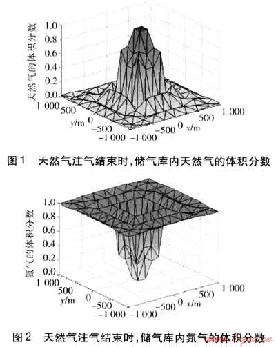 之后開始向儲(chǔ)氣庫(kù)注入天然氣,運(yùn)行到第116天時(shí),累積注入量(10022400m3)約達(dá)到目標(biāo)注氣量,停止注氣。天然氣注入結(jié)束時(shí),儲(chǔ)氣庫(kù)內(nèi)天然氣及氮?dú)獾捏w積分?jǐn)?shù)見圖1、2。由圖1、2可知,隨著天然氣的注入,天然氣逐漸將氮?dú)庀蛑車?qū)開,因而注采井周圍區(qū)域?yàn)榧兲烊粴鈪^(qū);由于氣體擴(kuò)散,天然氣與氮?dú)庀嗷交?,因而從注采井逐漸向外,天然氣的體積分?jǐn)?shù)逐漸減小,氮?dú)獾捏w積分?jǐn)?shù)逐漸增大,形成天然氣與氮?dú)獾幕旌蠋?;再逐漸向外,為純氮?dú)鈪^(qū)。