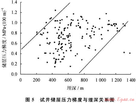 其中,嚴(yán)重欠壓儲層(儲層壓力梯度小于0.5MPa/100m)占21.2%,欠壓儲層(儲層壓力梯度介于0.5~0.75MPa/100m)占29.4%,略欠壓儲層(儲層壓力梯度介于0.75~0.90 MPa/100m)占18.8%,正常壓力儲層(儲層壓力梯度介于0.90~1.10MPa/100m)占27.1%,超壓儲層(儲層壓力梯度大于1.10MPa/100m)占3.5%(圖4)。儲層壓力梯度總體隨埋深的增加呈現(xiàn)出增大的趨勢(圖5)。