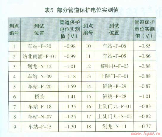 區(qū)域二兩座深井陽極安裝后,對(duì)管網(wǎng)進(jìn)行了-段時(shí)間的極化,各測(cè)試點(diǎn)保護(hù)電位測(cè)試結(jié)果見表5,大多數(shù)檢測(cè)點(diǎn)的電位在-0.85V至-l.5V之間,達(dá)到了保護(hù)電位,但也有小部分電位在-0.85V以卜達(dá)不到保護(hù)電位,個(gè)別在-1.5v以下,管網(wǎng)處于過保護(hù)狀態(tài)。