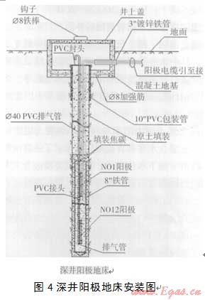 公司于2011年3月苗‘先啟動(dòng)了Ⅸ域二的深井陽極電流保護(hù)工程。經(jīng)計(jì)算管道保護(hù)面積為19 631m2,設(shè)計(jì)保護(hù)電流密度為lomA/m2,保護(hù)總電流為196A,在南浦氣化站和位于車站大道的公用集團(tuán)內(nèi)各設(shè)置1座深井陽極陰極保護(hù)站。每個(gè)站內(nèi)設(shè)l00A/100V恒電位儀2臺(tái),-開-備。在站內(nèi)距離管線50m~100m的低洼潮濕、土層較厚處鉆建直立式陽極地床,升深60m,井內(nèi)裝分段預(yù)制型陽極體7組,規(guī)格為Ф325×6 000,內(nèi)裝Ф75×1 500高硅鑄鐵陽極3支。將高硅鑄鐵陽極、高性能碳素填料,PVC排氣管,部分陽極引線電纜,井套管組合裝配為-體,便于運(yùn)輸和安裝,并可保證裝配精度和質(zhì)量(圖4)。每500m左有設(shè)置-個(gè)測(cè)試樁或在原有閥門井內(nèi)設(shè)置測(cè)試點(diǎn)。對(duì)于平行或跨越管道按-定間距或在最接近處作均壓處理,使電位分布均衡。