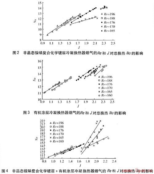 非晶態(tài)鎳磷復(fù)合化學(xué)鍍層冷凝換熱器煙氣的Re和J,對總換熱Nu的影響見圖2,有機涂層冷凝換熱器煙氣的Re和J對總換熱Nu的影響見圖3,非晶態(tài)鎳磷復(fù)合化學(xué)鍍層+有機涂層冷凝換熱器煙氣的Re和J對總換熱№的影響見圖4。