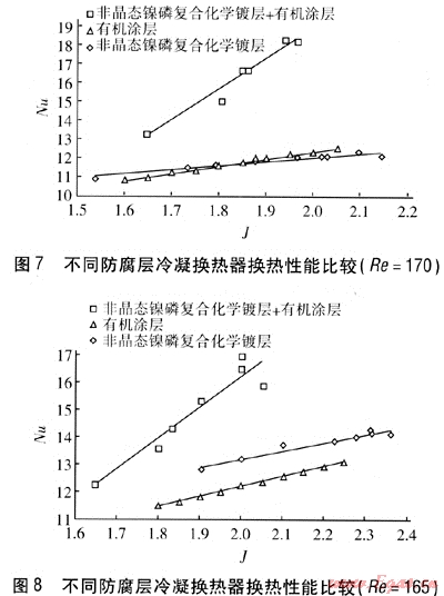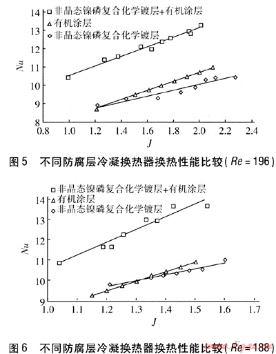 本實驗通過對不同防腐層冷凝換熱器換熱性能的測定得出,冷凝換熱器換熱性能不僅隨Re和J的增大而增強,而且對于不同防腐層的冷凝換熱器,其換熱性能隨Re和J的變化速率也不同;在相同工況下,3種不同防腐層的冷凝換熱器的換熱性能不同,非晶態(tài)鎳磷復(fù)合化學(xué)鍍層+有機涂層冷凝換熱器換熱能力最強,有機涂層冷凝換熱器換熱能力與非晶態(tài)鎳磷復(fù)合化學(xué)鍍層冷凝換熱器換熱能力相當(dāng)。