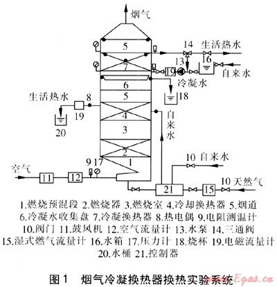 水系統(tǒng):本實驗將冷卻段和冷凝段的水路分開,讓冷卻水分兩路分別進入冷卻換熱器4和冷凝換熱器7。進入冷卻換熱器的水與煙氣換熱后流經(jīng)電磁流量計19后流入水桶20中,用作生活熱水。對于進入冷凝換熱器的冷卻水,通過調(diào)節(jié)三通閥14的回水量,即調(diào)節(jié)冷熱水比例來調(diào)節(jié)冷卻水進水溫度,冷卻水與煙氣換熱,部分通過三通閥14進行循環(huán),部分流出,作為生活熱水。在冷凝段的水路上,加設(shè)水箱定壓,以消除水壓不穩(wěn)對進入冷凝換熱器的冷卻水流量的影響。