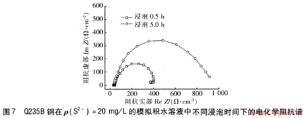 圖7為Q235B鋼在ρ(S2-)=20mg/L的模擬積水溶液中分別浸泡0.5h和浸泡5h所得的電化學(xué)阻抗譜。由圖7可知,隨浸泡時間的不同,Nyquist圖的形狀有明顯不同。浸泡時間短時,Nyquist圖由一個高頻容抗弧和一個低頻小感抗弧組成。當(dāng)浸泡時間由0.5h增大到5h時,Nyquist圖表現(xiàn)為一個大容抗弧,低頻感抗弧已經(jīng)消失,且大容抗弧的半徑顯著變大,即其阻抗增大。說明在模擬積水溶液中,隨著浸泡時間的延長,S2-對Q235B鋼表面電化學(xué)反應(yīng)的抑制作用增強(qiáng)。