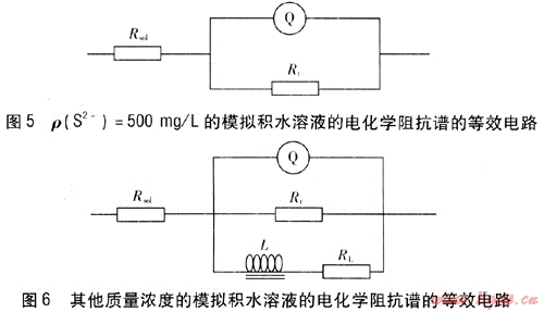 根據(jù)Q235B鋼在該腐蝕體系中的阻抗譜特征,應(yīng)用圖5和圖6所示的等效電路對圖3中的EIS數(shù)據(jù)進(jìn)行擬合,圖5為ρ(S2-)=500mg/L的模擬積水溶液的電化學(xué)阻抗譜的等效電路,圖6為其他質(zhì)量濃度模擬積水溶液的電化學(xué)阻抗譜的等效電路。