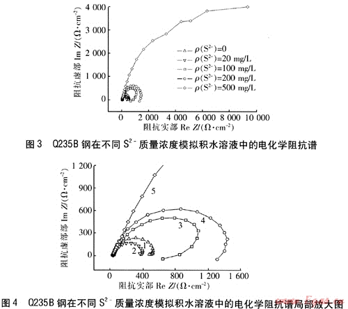 圖3為Q235B鋼在不同S2-質(zhì)量濃度的模擬積水溶液中的電化學(xué)阻抗譜,圖4為圖3的局部放大圖。