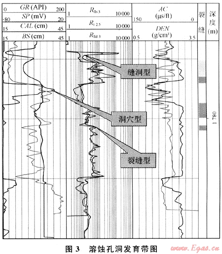 小型溶洞及溶孔在測(cè)井曲線(xiàn)上特征不太明顯,只在溶蝕孔洞發(fā)育段表現(xiàn)為深淺側(cè)向電阻率曲線(xiàn)顯示較低的電阻率值,且出現(xiàn)正幅度差,即深側(cè)向電阻率值大于淺側(cè)向電阻率值,自然伽馬比純石巖段略高;聲波時(shí)差和中子測(cè)井值增大,密度測(cè)井值降低,并有擴(kuò)徑現(xiàn)象。在巖心和薄片上較易觀察。也可以用微電阻率成像測(cè)井(FMI)來(lái)進(jìn)行觀察。