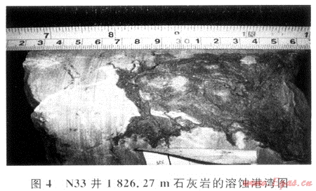 碳酸鹽巖是一種化學(xué)性較活潑的巖石,具有可溶蝕性,而且基本上貫穿其成巖作用的各個(gè)階段,只是溶蝕強(qiáng)度有明顯差異。該成巖作用常常導(dǎo)致孔、洞的大量發(fā)育,對(duì)改善儲(chǔ)層的儲(chǔ)集性能具有非常積極的意義。如南33井1826.27m奧陶系下馬家溝組巖心表面見(jiàn)有方解石充填物的溶蝕孔洞,洞徑約3×6mm,肉紅色石灰?guī)r邊緣還見(jiàn)溶蝕形成的港灣狀(見(jiàn)圖4)。