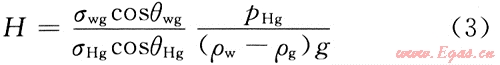 在毛細管壓力曲線上,一定壓力對應的非潤濕相飽和度相當于氣藏中一定高度的含氣飽和度,因此,把毛細管壓力曲線的縱坐標用自由水面以上的液柱高度來表示,就可以用該曲線來確定出氣藏中任意高度上的含氣飽和度,從而得出整個氣藏的氣水縱向分布特征。自由水面以上液柱高度的計算公式為: