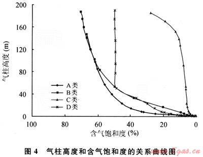 毛細管力曲線與地下流體飽和度具有函數關系,而自由水面以上的氣液柱高度又是由毛細管力決定的,因此,地下流體飽和度也是自由水面以上氣液柱高度的函數,氣柱高度等于自由水面以上氣液柱高度減去靜水壓力對應的自由水面以上液柱高度。據此,利用澀北疏松砂巖氣藏4類典型的毛細管力曲線,就可以計算得出氣柱高度和含氣飽和度之間的關系曲線(圖4)。
