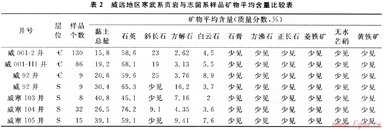 但比較四川盆地寒武系和志留系頁巖,筆者認(rèn)為,四川盆地頁巖氣勘探開發(fā)的首選目標(biāo)應(yīng)為川南志留系,理由如下:①盡管寒武系和志留系烴源巖都有較高的有機(jī)碳豐度和較好的有機(jī)質(zhì)類型,但志留系烴源巖的成熟度略低于寒武系。②運(yùn)聚條件不同,志留系烴源巖在川南地區(qū)生烴強(qiáng)度大于川東地區(qū),但在川東地區(qū),石炭系直接覆蓋在志留系之上,由于石炭系有較好的滲儲(chǔ)條件,所以形成大中型氣田[5],而川南地區(qū)雖處生烴凹陷,但由于石炭系缺失,所以二疊系直接覆蓋在志留系之上,而二疊系孔隙不發(fā)育,滲儲(chǔ)空間主要為裂縫。已有的研究表明,二疊系甚至三疊系嘉陵江組都有天然氣來自志留系,但沒有形成向石炭系那樣的大氣田。顯然川南地區(qū)志留系排烴程度沒有川東地區(qū)高,換句話說,滯留在川南志留系中的天然氣應(yīng)當(dāng)較多。據(jù)不完全統(tǒng)計(jì),川南地區(qū)鉆遇志留系有氣顯示的井有8口,也說明這一現(xiàn)象。寒武系生烴條件最好的地區(qū)是川西南地區(qū),而它受樂山龍女寺古隆起的影響較大,具備向震旦系輸氣的條件,也就是說它自身滯留天然氣的條件不如川南志留系。③礦物成分不同。從表2可見,威遠(yuǎn)地區(qū)寒武系頁巖的石英含量與志留系差不多,但黏土含量低于志留系的頁巖,而黏土與吸附氣的多少有關(guān),石英則與造縫能力相關(guān)。