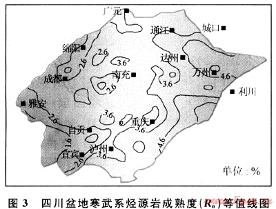 四川盆地下志留統(tǒng)泥質(zhì)烴源巖Ro值為2.2%~4.0%,已演化至過成熟階段。川南地區(qū)成熟度較低,普遍小于2.8%(圖7)。晚二疊世末,志留系源巖Ro值演化至0.9%,開始進(jìn)入成油期。三疊紀(jì)之后,由于沉積速度加快,志留系埋藏速率也相應(yīng)加快,志留系烴源巖在壓力和溫度作用下,熱演化加速。到中三疊世末時(shí),很多地區(qū)的Ro值已迅速演化至1.3%。志留系烴源巖生成大量的液態(tài)烴。中侏羅世后,沉積作用仍然快速進(jìn)行,志留系地層仍處于快速埋藏狀態(tài),Ro值從1.3%迅速演化至2.2%,有機(jī)質(zhì)演化至高成熟期,處于濕氣轉(zhuǎn)化階段。從白堊系開始,大部分地區(qū)的志留系烴源巖有機(jī)質(zhì)R。值都超過了3%,進(jìn)入過成熟期,主要形成干氣。
