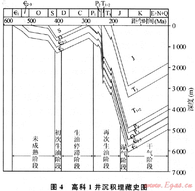 根據(jù)高科1井的沉積埋藏史圖(圖4)可見,樂山-龍女寺古隆起區(qū)下寒武統(tǒng)源巖經(jīng)歷了埋藏-抬升(剝蝕)-再埋藏-再抬升的演化過程。其有機(jī)質(zhì)生烴史可分為三期:第一期為初始生烴階段:高科1井下寒武統(tǒng)源巖在志留紀(jì)末R。值已達(dá)0.7%,處于未成熟一低成熟生烴期;第二期為生烴停滯階段,由于加里東運(yùn)動的抬升作用,該井下寒武統(tǒng)源巖埋深變淺并遭受剝蝕,古地溫降低,有機(jī)質(zhì)進(jìn)入生烴滯流階段;第三期為“二次生烴”階段:從二疊系開始至二疊系末,下寒武統(tǒng)源巖埋藏深度及其所具有的古地溫已超過了初始生烴階段,源巖進(jìn)入了二次生烴階段。此時(shí),高科1井毛。源巖Ro值已達(dá)0.71%,有機(jī)質(zhì)開始繼續(xù)生烴。印支末期,高科1井