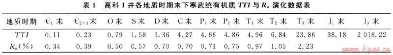 源巖Ro值已達(dá)2.23%,有機(jī)質(zhì)大量生成濕氣及油裂解氣。喜山期,該區(qū)源巖進(jìn)入過成熟末期,現(xiàn)今實(shí)測最高Ro值已達(dá)3.75%,表明該區(qū)下寒武統(tǒng)源巖目前生烴已近枯竭,但也說明它的生烴能力巨大,歷史上曾經(jīng)大量生烴(表1)。