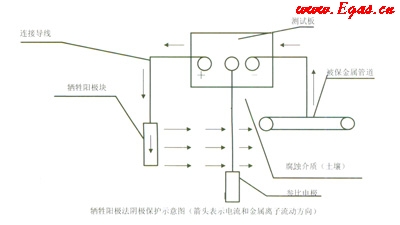 如果陽(yáng)極開路電位大于管道保護(hù)電位,即大于管道最小保護(hù)電位,則金屬管道得不到保護(hù),反遭腐蝕。金屬管道進(jìn)行氧化反應(yīng),陽(yáng)極塊進(jìn)行還原反應(yīng),其原理與上圖相反,見(jiàn)示意圖: