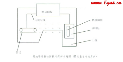 針對(duì)埋地管道電解化學(xué)腐蝕的過(guò)程和實(shí)際情況,我們應(yīng)從兩方面解決管道的防腐問(wèn)題。一是加強(qiáng)管道的絕緣性:①管道第一層涂環(huán)氧粉末;②第二層涂聚乙烯(PE);③第三層涂EVA樹脂。增火回路電阻,減少腐蝕電流。二是用犧牲陽(yáng)極保護(hù)法,對(duì)管道進(jìn)行陰極保護(hù)。見(jiàn)示意圖: