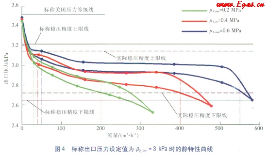 根據(jù)標(biāo)準(zhǔn)GB 27790—2011的判定要求,僅根據(jù)圖4無(wú)法判定該調(diào)壓器的靜特性是否滿足標(biāo)稱參數(shù)(表2中dp1=0.2~0.6MPa和dp2=2~4kPa對(duì)應(yīng)流量參數(shù))的要求,還需要根據(jù)表2所示的標(biāo)稱出口壓力設(shè)定值p2,min=2kPa和p2,max=4kPa參數(shù)條件下的靜特性試驗(yàn)數(shù)據(jù),繪制相應(yīng)的靜特性曲線圖,并根據(jù)繪制的靜特性曲線圖求得相應(yīng)條件下的實(shí)際穩(wěn)壓精度等級(jí)、實(shí)際關(guān)閉壓力等級(jí)、實(shí)際關(guān)閉壓力區(qū)等級(jí)和實(shí)際靜特性曲線族的關(guān)閉壓力區(qū)等級(jí)。只有三幅靜特性曲線圖對(duì)應(yīng)的實(shí)際穩(wěn)壓精度等級(jí)數(shù)值、實(shí)際關(guān)閉壓力等級(jí)數(shù)值、實(shí)際關(guān)閉壓力區(qū)等級(jí)數(shù)值和實(shí)際靜特性曲線族的關(guān)閉壓力區(qū)等級(jí)數(shù)值均不大于相應(yīng)的標(biāo)稱參數(shù)值Ac=10、Sg=20、Sz=20和Sz,p=20,才能夠判定該調(diào)壓器在dp1=0.2~0.6MPa、dp2=2.0~4.0kPa和表2所示流量參數(shù)條件下的靜特性滿足標(biāo)稱的靜特性參數(shù)要求。