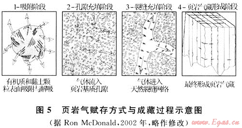頁巖氣藏中氣體的賦存形式多種多樣,其中絕大部分是以吸附氣的形式賦存于頁巖內(nèi)有機質(zhì)和黏土顆粒的表面,這與煤層氣相似。吸附氣量與有機碳含量、地層壓力等因素有關(guān)。游離氣則聚集在頁巖基質(zhì)孔隙或裂縫(主要為微裂縫)中,這與常規(guī)氣藏中的天然氣相似。此外,可能還有極少部分頁巖氣以溶解氣形式存在于頁巖孔隙束縛水或瀝青中。因此,頁巖氣的形成機理兼具煤層吸附氣和常規(guī)天然氣兩者特征,為不間斷充注、連續(xù)聚集成藏(圖5)。在頁巖氣成藏過程中,隨天然氣富集量增加,其賦存方式發(fā)生改變,完整的頁巖氣藏充注與成藏過程可分為4個階段[4]。第一階段為天然氣生成與吸附階段,該階段形成的頁巖氣藏具有與煤層氣相似的成藏機理;第二階段為吸附氣量(包括部分溶解氣量)達到飽和時,富余氣體解吸或直接充注到頁巖基質(zhì)孔隙中(也不排除少量直接進入了微裂縫中),其富集機理類似于孔隙型儲層中天然氣的聚集;第三階段是隨著大量氣體的生成,頁巖基質(zhì)孔隙內(nèi)溫度、壓力升高,出現(xiàn)巖石造縫以及天然氣以游離狀態(tài)進入頁巖裂縫中成藏;經(jīng)過前述三個過程后,天然氣最終以吸附氣和游離氣的形式富集形成頁巖氣藏,即頁巖氣藏形成階段。