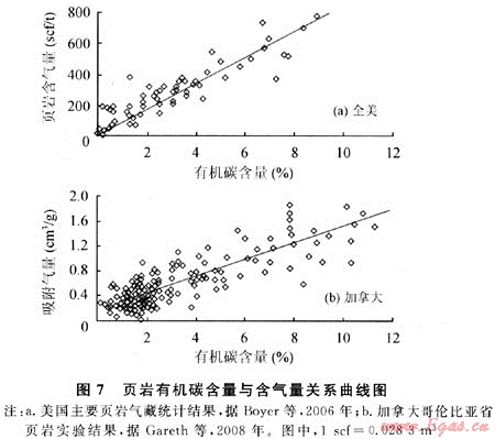 2) 有機碳含量愈高,氣藏富集程度愈高。商業(yè)性頁巖氣藏需要達到頁巖有機碳含量最低界限標準。斯倫貝謝公司對北美頁巖氣盆地的研究認為,頁巖氣藏的有機碳含量最低標準原則上應(yīng)大于2.0%(表4)。因此,有機碳含量是頁巖氣藏評價中的一個重要指標,它既是頁巖生氣的物質(zhì)基礎(chǔ),決定頁巖的生烴強度,也是頁巖吸附氣的載體之一,決定頁巖的吸附氣大小,還是頁巖孔隙空間增加的重要因素之一,決定頁巖新增游離氣的能力。在相同的地質(zhì)條件及演化階段下,頁巖生烴強度、吸附氣量大小及新增游離氣能力與頁巖中有機碳含量呈明顯的線性正相關(guān)性。實驗分析結(jié)果表明,頁巖含氣量(吸附氣及游離氣總量)隨頁巖有機碳含量的增加而增大(圖7-a)。對加拿大哥倫比亞省下白堊統(tǒng)BuckingHorse組202塊頁巖樣品的等溫吸附實驗結(jié)果也同樣表明[7],頁巖有機碳含量與甲烷吸附量之間呈正相關(guān)分布(圖7-b)。此外,不同母質(zhì)類型、不同演化程度的頁巖,其等溫吸附曲線也存在明顯差別。頁巖有機質(zhì)類型越好,甲烷的吸附量越大[7]。但與此同時,圖6、圖7中也存在一些異?,F(xiàn)象,說明頁巖含氣量大小不僅僅受有機碳含量的影響,還可能受其他多種因素的影響,如黏土成分及含量、有機質(zhì)熱成熟度、頁巖含水量等。對此,尚需作進一步的深入研究。