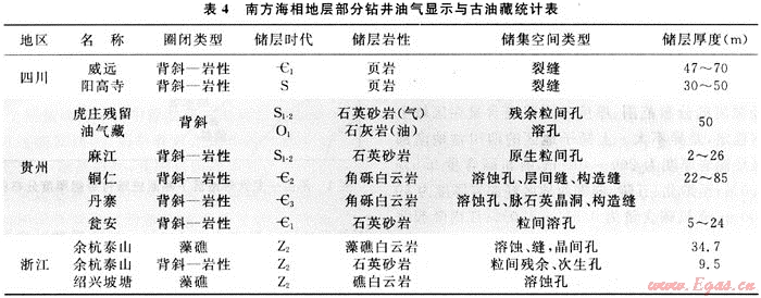 5) 鉆井天然氣顯示:不完全統(tǒng)計,早期在常規(guī)油氣勘探過程中,在100口余鉆井中見到天然氣顯示或露頭發(fā)現(xiàn)古油藏及頁巖氣顯示(表4)。據(jù)四川盆地威遠地區(qū)36口鉆井統(tǒng)計,筇竹寺組頁巖有30口井發(fā)現(xiàn)氣顯示,志留系龍馬溪組13口井中有10口見氣顯示。威遠地區(qū)的威5、威9、威18、威22和威28等井下寒武統(tǒng)泥頁巖均見氣侵井涌和井噴,其中威5井下寒武統(tǒng)筇竹寺組2795~2798m頁巖井段發(fā)現(xiàn)氣侵與井噴,中途測試日產(chǎn)氣2.46×104m3,酸化后日產(chǎn)氣1.35×104m3。川東南地區(qū)陽高寺構(gòu)造帶的陽深2、宮深1、付深1、陽63、陽9、太15和隆32等井在下志留統(tǒng)龍馬溪組多處發(fā)現(xiàn)氣顯示,其中陽63井下志留統(tǒng)龍馬溪組3505~3518.5m黑色頁巖段,酸化后獲日產(chǎn)氣3500m3,隆32井下志留統(tǒng)龍馬溪組3164.2~3 175.2m黑色碳質(zhì)頁巖段獲日產(chǎn)氣1948m3。另外,20世紀70年代中期在貴州大方地區(qū)鉆探的方深1井,在下寒武統(tǒng)牛蹄塘組也發(fā)現(xiàn)良好氣顯示。該井下寒武統(tǒng)牛蹄塘組鉆遇井深1686~1785m,厚99m,巖性上部為一套深灰色含碳質(zhì)粉、細砂巖與碳質(zhì)頁巖互層,中-下部為黑色碳質(zhì)頁巖。有機碳含量2.97%~8.02%;氯仿瀝青“A”含量0.087%~0.11%,成熟度為高-過成熟。鉆井中,在1723.4~1726.7m井段見氣測異常,泥漿見雨狀氣泡,含氣38%,點燃呈藍色火焰,下伏震旦系全井段氣測異常,電測解釋6個含氣層、3個可能含氣層。