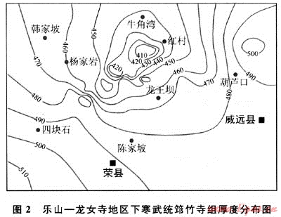 2) 下寒武統(tǒng)頁巖地層:分布面積大、范圍廣,可及整個揚子地臺區(qū),現(xiàn)今殘留面積約90×104km2。烴源巖厚度50~500m,其中厚度大于50m以上烴源巖面積約58×104km2。發(fā)育的層位相當穩(wěn)定,以下寒武統(tǒng)筇竹寺組為主,與之相當?shù)倪€有川黔鄂地區(qū)的牛蹄塘組或水井沱組、蘇浙皖地區(qū)的荷塘組、冷泉王組等。巖性主要為暗色頁巖、黑色碳質(zhì)頁巖、碳硅質(zhì)頁巖、黑色粉砂質(zhì)頁巖。上揚子地區(qū)的滇東、黔東北地區(qū)的頁巖地層普遍含磷,下?lián)P子地區(qū)夾石煤層。有機碳含量多在2.0%以上,最高可達13.64%,平均為2.77%。四川盆地下寒武統(tǒng)筇竹寺組井下樣品測試,有機碳含量平均為0.36%~5.03%,露頭樣品分析,有機碳含量平均為1.92%~2.35%(表3)。母質(zhì)類型以腐泥型干酪根為主,少量為腐殖型。干酪根δ13C為-29.82‰~-32.92‰(PDB),平均為-30.88‰,成烴潛力大。上揚子與下?lián)P子地區(qū)頁巖演化程度較高,Ro一般大于3%,最高可至5%及以上;中揚子地區(qū)頁巖的演化程度略低,Ro為2.0%~3.0%,部分還小于2.0%。目前在揚子區(qū)已發(fā)現(xiàn)的古油藏,如貴州甕安古油藏、麻江古油藏、銅仁古油藏、浙江泰山古油藏、湘西南山坪古油藏、紹興坡塘古油藏等,油源均來自于下寒武統(tǒng)烴源巖。下寒武統(tǒng)烴源巖的分布范圍、厚度及有機碳含量在區(qū)域上基本穩(wěn)定,差異不大。上揚子地區(qū)的四川盆地南部地區(qū)烴源巖厚度為200~400m,有機碳含量0.5%~5.00;至黔北、五陵、湘鄂西地區(qū)烴源巖厚度為50~500m,有機碳含量為0.5%~3.0%;江南隆起北緣生油區(qū)烴源巖厚度為200~400m,有機碳含量為0.5%~2%,至下?lián)P子地區(qū)西北部生油區(qū)烴源巖厚度是50~120m,有機碳含量為0.5%~5%;皖南、蘇南生油區(qū)烴源巖相對不發(fā)育,厚度在50m左右,有機碳含量為0.50~4%。下寒武統(tǒng)烴源巖生烴強度較高,部分地區(qū)為(100~200)×108m3/km2。四川盆地下寒武統(tǒng)筇竹寺組黑色頁巖厚74~400m,有機碳含量0.5%~4.1%,Ro為1.83%~3.26%。樂山-龍女寺地區(qū)下寒武統(tǒng)筇竹寺組發(fā)育最好(圖2),為一套淺水陸棚環(huán)境下沉積的黑色、深灰色頁巖,厚度一般為100~400m,資陽-威遠地區(qū)較厚,達250~350m,由古隆起頂部向南部坳陷區(qū)厚度大幅度增加。
