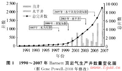 開發(fā)技術的創(chuàng)新尤其是水平井鉆井、壓裂技術以及裂縫綜合診斷技術的進步與廣泛運用在推動沃斯堡盆地Barnett頁巖氣藏的快速發(fā)展中起著至關重要的作用。1981年,Barnett頁巖區(qū)在按計劃鉆探過程中偶然發(fā)現(xiàn)顯示良好的Barnett頁巖層段。自1981年第一口發(fā)現(xiàn)井到1992年歷經(jīng)10a生產(chǎn)井僅99口,開發(fā)緩慢。1997年后,水力壓裂開始取代凝膠壓裂成為頁巖氣主要的增產(chǎn)措施,Barnett頁巖氣的開發(fā)也隨之加快了前進的步伐。隨著1999年重復壓裂、2003年水平鉆井以及2005年水平井分段壓裂等一系列新技術的廣泛運用,Barnett頁巖氣發(fā)展速度驚人(圖2),從1997~2007年的10a時間里,Barnett頁巖氣區(qū)有多達8629口頁巖氣井投入生產(chǎn)(其中水平井4973口,占50%以上)。新技術的運用同樣使Barnett頁巖氣產(chǎn)量發(fā)生了翻天覆地的變化,截至2008年1月,Barnett頁巖氣產(chǎn)量約0.996×108m3/d,累計產(chǎn)量1044.9×108m3[3]。
