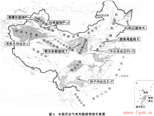 我國中、新生界陸相沉積尤其發(fā)育,并已被勘探開發(fā)實(shí)踐證實(shí)其中的絕大部分富有機(jī)質(zhì)泥頁巖為含油氣盆地中的優(yōu)質(zhì)烴源巖,如松遼盆地下白堊統(tǒng)的青山口組黑色泥頁巖、渤海灣盆地古近系沙河街組的泥頁巖、鄂爾多斯盆地上三疊統(tǒng)延長組的張家灘(T3yc3)、李家畔(T3yc2)頁巖等。前人研究表明,中國北方陸相泥頁巖烴源巖母質(zhì)來源以浮游生物、細(xì)菌、高等植物為主,具有多種干酪根類型,TOC平均為2%~3%,最高可達(dá)8%,埋深2000~3000m,Ro為0.8%~1.2%,處于液態(tài)烴與氣態(tài)烴并重階段。其中在我國中西部地區(qū)的晚石炭世-二疊紀(jì)、晚三疊世-早中侏羅世還發(fā)育兩期煤系沉積,分布廣泛,天然氣資源豐富,煤層氣資源量約16.5×1012m3。對(duì)中-下侏羅統(tǒng)煤系沉積進(jìn)行研究,發(fā)現(xiàn)中-下侏羅統(tǒng)煤系中廣泛發(fā)育高碳泥頁巖,厚度為40~100m,TOC為20%~30%,Ro為0.8%~1.2%,母質(zhì)類型為腐殖型,是一套頁巖氣藏形成的有利目的層系。綜合多種地質(zhì)條件,認(rèn)為松遼盆地白堊系頁巖,準(zhǔn)噶爾盆地南緣上二疊統(tǒng)、中-下侏羅統(tǒng)頁巖,陜甘寧盆地上三疊統(tǒng)頁巖以及吐哈盆地中-下侏羅統(tǒng)碳質(zhì)頁巖是有利的頁巖氣形成層系和地區(qū)。