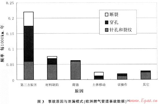 實踐證明,管網(wǎng)長期低壓運行,一旦升高管網(wǎng)運行壓力將增大由于材料缺陷和腐蝕引起天然氣泄漏的機率。但是從歐洲燃?xì)夤艿赖慕y(tǒng)計數(shù)據(jù)來看(圖3)。管道自身原因?qū)е碌男孤┩容^輕微(針孔和裂紋)。發(fā)生重大事故的可能性較小。因此,升壓運行帶來的風(fēng)險并不大,并且完全可以通過采取必要的保護(hù)措施加以規(guī)避。