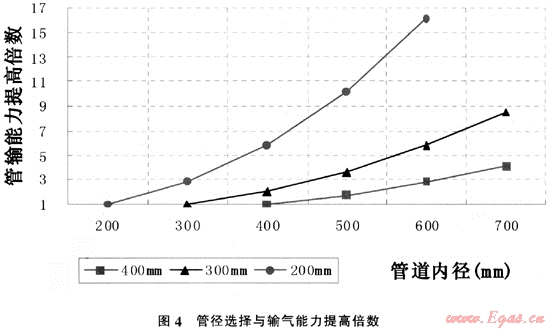 舊有的管網(wǎng)系統(tǒng)中管徑較小的管道有可能是制約管網(wǎng)通過能力的瓶頸。通過管網(wǎng)計算,北京市中壓管網(wǎng)主干線個別管段由于管徑較小,嚴(yán)重阻礙了管網(wǎng)輸送,應(yīng)將此管段進(jìn)行擴(kuò)徑,如香山南路管線,管徑為DN400。全長4000m。其中有一段DN100,導(dǎo)致附近壓力偏低,若將此段管線改為DN400,附近壓力由0.04MPa,升到0.06MPa。圖5所示為擴(kuò)大管徑對管輸能力提高倍數(shù)的影響,計算式: