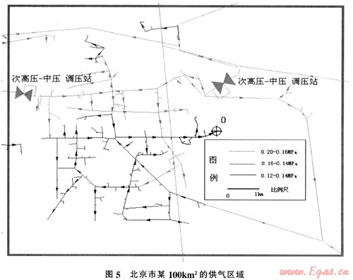 如圖5所示為北京市某區(qū)域天然氣管網(wǎng)圖,其供氣區(qū)域約為100km2。此區(qū)域內(nèi)中壓管網(wǎng)氣源,為兩座高中調(diào)壓站,供應(yīng)壓力為0.2MPa,高時總負(fù)荷70000(m3/h),負(fù)荷點422個.根據(jù)管網(wǎng)模擬軟件計算可知末端壓力為0.131MPa。處于該區(qū)域的東部(如上圖黑管線)。根據(jù)規(guī)劃此區(qū)域內(nèi)負(fù)荷將有明顯的增加.因此.必須提早做出切實可行的管網(wǎng)改造方法。
