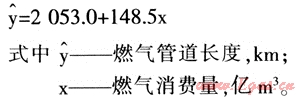管道長度的增加是管網(wǎng)改造的主要成本之一,只有用管線總長度最小的管網(wǎng)銷售最大的用氣量,才能得到最高的系統(tǒng)利用效率。北京市天然氣用量近年來增長很大,負(fù)荷的增加與管網(wǎng)建設(shè)存在一定關(guān)聯(lián),通過對1995年—2008年間北京市天然氣管線長度與天然氣消費量的變化進(jìn)行分析,得出如下的回歸方程: