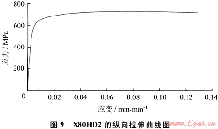 用于西二線的抗大變形鋼管已試制成功。表4是西二線抗大變形管線鋼技術(shù)條件對縱向拉伸性能的要求。表5為外徑1219mm、壁厚22mm X80HD2鋼管的縱向拉伸性能測試結(jié)果。圖9為其縱向拉伸曲線。根據(jù)此拉伸曲線,利用FEM(Finite Element Method)方法進(jìn)行壓縮和彎曲載荷下的應(yīng)變能力計算,結(jié)果見表6。