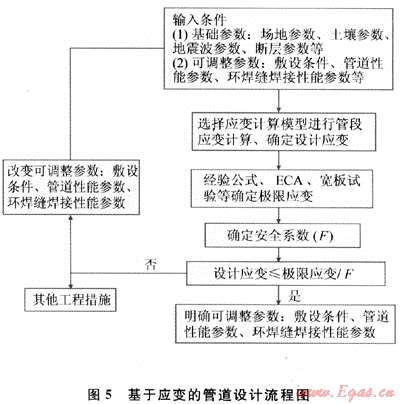 中石油《西氣東輸二線工程關(guān)鍵技術(shù)研究》重大專項設(shè)置課題研究了西二線基于應(yīng)變的設(shè)計方法并進(jìn)行了抗大變形管線鋼的研究與開發(fā)。中石油規(guī)劃設(shè)計總院和管道設(shè)計院編制了《西氣東輸二線管道工程強震區(qū)和活動斷層區(qū)段埋地管道基于應(yīng)變設(shè)計導(dǎo)則》[10~11]?;趹?yīng)變的管道設(shè)計流程如圖5所示。核心環(huán)節(jié)是設(shè)計應(yīng)變小于等于極限應(yīng)變/安全系數(shù)。此處的極限應(yīng)變就是鋼管應(yīng)力-應(yīng)變曲線中的屈曲應(yīng)變。它可以直接由鋼管實物試驗測出,也可由經(jīng)驗公式、ECA(Engineer Critical Assessment)、寬板試驗等確定。