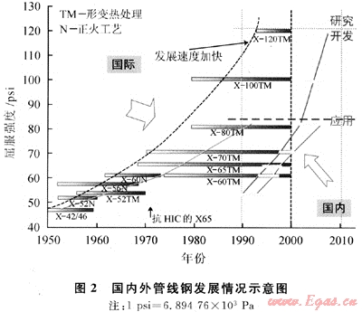 提高管線鋼管鋼級和輸送壓力是天然氣管道建設(shè)強勁的發(fā)展趨勢,API標(biāo)準(zhǔn)的發(fā)展也反映了這種趨勢。圖2為我國與發(fā)達(dá)國家管線鋼發(fā)展情況對比示意圖[6]。20世紀(jì)90年代之前,我國天然氣管道普遍采用A3、16Mn、TS52K等低強度焊管,輸送壓力大都在4MPa以下。我國按API標(biāo)準(zhǔn)生產(chǎn)和使用管線鋼管比發(fā)達(dá)國家滯后約40年。1993年,陜京管線采用X60鋼級、6.4MPa壓力,縮小了與發(fā)達(dá)國家的差距;2000年,西氣東輸(為便于區(qū)別,以下稱為西氣東輸一線)管線采用X70鋼級、10MPa壓力,跟上了發(fā)達(dá)國家的步伐;現(xiàn)在,西氣東輸二線干線全部采用X80鋼級,西段采用12MPa設(shè)計壓力,使我國管道建設(shè)跨上了新的臺階。就全球已經(jīng)建成和正在建設(shè)的X80輸氣管道而言,無論是設(shè)計壓力、管道長度,還是管徑、壁厚,西氣東輸二線(簡稱西二線)均堪稱世界之最。