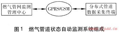燃?xì)夤艿罓顟B(tài)自動(dòng)監(jiān)測(cè)系統(tǒng)包括監(jiān)測(cè)管理中心、GPRS/GSM(GPRS為通用分組無(wú)線業(yè)務(wù),GSM為全球移動(dòng)通信系統(tǒng))、分布式管道數(shù)據(jù)采集終端,系統(tǒng)組成見圖1。