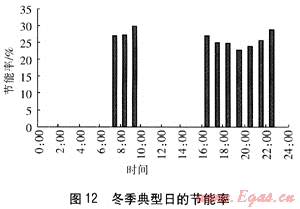 PEMFC建筑熱電聯(lián)供系統(tǒng)的節(jié)能率定義為滿足相同的電、熱水需求條件,PEMFC建筑熱電聯(lián)供系統(tǒng)比基準(zhǔn)方案節(jié)約燃料量與基準(zhǔn)方案消耗燃料最之比。PEMFC建筑熱電聯(lián)供系統(tǒng)在冬季工況和夏季工況的節(jié)能率見圖12、13。