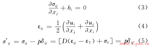 與常規(guī)應(yīng)力應(yīng)變方程相比,式(5)增加了熱應(yīng)變項(xiàng)、初始地應(yīng)力項(xiàng)和流體壓力項(xiàng),以表征3個(gè)物理場之間的耦合作用。