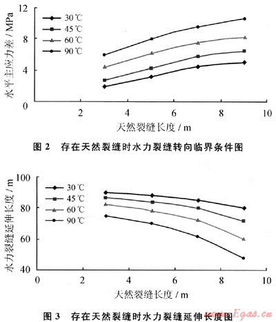 水力裂縫迂曲轉(zhuǎn)向的臨界條件隨著天然裂縫數(shù)量、天然裂縫與最大水平主應(yīng)力方向的夾角和天然裂縫長度的不同而發(fā)生改變。由圖2和圖3可以看出:當(dāng)天然裂縫長度增加時(shí),水力裂縫發(fā)生迂曲轉(zhuǎn)向所需的水平主應(yīng)力差也增加,但增加幅度逐漸變??;水力裂縫的延伸長度逐漸減小,但減小幅度逐漸變大。當(dāng)天然裂縫與最大水平主應(yīng)力方向的夾角增加時(shí),水力裂縫發(fā)生迂曲轉(zhuǎn)向所需的水平主應(yīng)力差也隨之增加,但增加幅度逐漸變?。凰α芽p的延伸長度逐漸減小,但減小幅度逐漸變大。