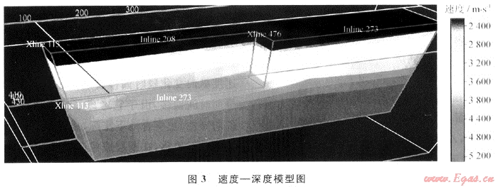 采用均方根速度轉(zhuǎn)換方法估算層速度與相干反演相結(jié)合的方法進(jìn)行層速度模型的建立。通過疊前時(shí)間偏移迭代后,均方根速度模型比較準(zhǔn)確,在一定程度上符合地質(zhì)變化規(guī)律。對于水平層狀或單傾的介質(zhì),均方根速度模型轉(zhuǎn)換的方法能得到較好的初始模型,并通過層析成像模型優(yōu)化能得到精確的速度模型。對于地層傾角變化較大、速度不均一的復(fù)雜斷塊,簡單的速度轉(zhuǎn)換方法不能合理地描述速度結(jié)構(gòu)。采用相干反演法與均方根速度轉(zhuǎn)換法聯(lián)合建立層速度模型,相互驗(yàn)證速度的合理性精度更高。通過分析沿層剩余速度,利用三維層析成像技術(shù)修改層速度模型優(yōu)化地質(zhì)模型,建立最優(yōu)速度-深度模型剛(圖3)。