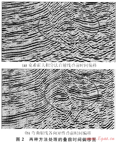 克希霍夫積分法疊前時(shí)間偏移,考慮了復(fù)雜陡傾界面的地層傾角及反射點(diǎn)彌散問題,能部分適應(yīng)速度在縱橫向的變化[4]。由于沒有考慮射線彎曲,所以在速度縱向變化較時(shí)偏移效果不理想彎曲射線各向異性疊前時(shí)間偏移,由于它考慮了成像射線的彎曲及速度各向異性,更符合地下實(shí)際,成像效果明顯優(yōu)于直射線疊前時(shí)間偏移,在斷層成像、斷塊劃分能力以及目的層內(nèi)幕反射特征上有很大的改善(圖2)。