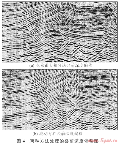 三維疊前深度偏移方法主要采用克?;舴蚍e分法,優(yōu)點(diǎn)是計(jì)算效率高,對野外觀測無任何限制適應(yīng)能力強(qiáng),且能較好的適應(yīng)大傾角偏移,具有抗假頻能力;缺點(diǎn)是射線多路徑問題、焦散、振幅保真處理問題和分辨率低等。研究人員通過兩種途徑來解決不足:①對現(xiàn)有的克?;舴蚍ㄔ诼眯袝r(shí)計(jì)算和偏移方法方面進(jìn)行改進(jìn),如從首波旅行時(shí)計(jì)算向基于波前重建的旅行時(shí)計(jì)算,其中考慮了多個(gè)射線,并且是利用體波旅行時(shí)、相對保幅處理和基于模型的孔經(jīng)定義等,改進(jìn)后的成像結(jié)果其構(gòu)造細(xì)節(jié)更加清楚可靠;②發(fā)展新的偏移方法,借助于高性能的PC-CLUSTER微機(jī)集群,采用波動(dòng)方程偏移方法,其成像結(jié)果更好。圖4可看出波動(dòng)方程疊前深度偏移在深層斷點(diǎn)歸位準(zhǔn)確、振幅頻率保持較好,成像精度更高[6]。