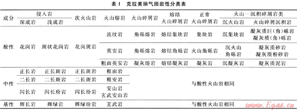 按照“成分+結(jié)構(gòu)、構(gòu)造+成因”的分類原則[1],對克拉美麗氣田石炭系火山巖巖石進行了分類及命名,共分為7大類、28小類、上百種巖石類型(見表1)。