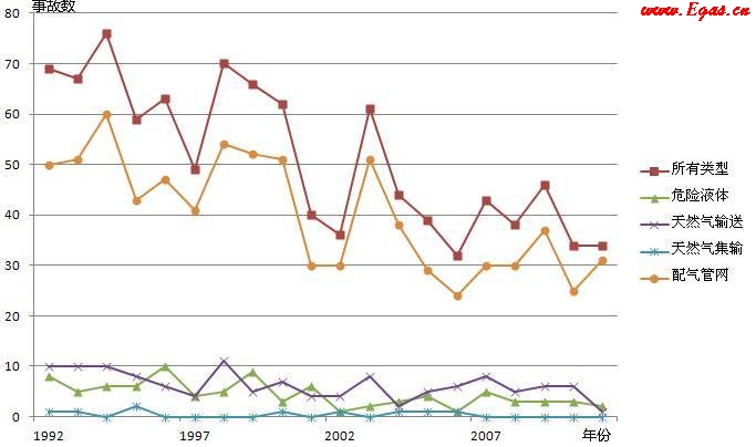 根據(jù)美國PHMSA管道失效數(shù)據(jù)庫統(tǒng)計,管道系統(tǒng)發(fā)生的重特大事故中,約80%是由城鎮(zhèn)燃氣管網(wǎng)導致的事故(見圖 1),因此針對城鎮(zhèn)燃氣管網(wǎng)開展完整性管理具有重要意義。美國針對DIMP的研究從2000年左右開始。2005年管道和危險材料安全管理局(Pipeline&HazardousMaterialsSafetyAdministration,簡稱PHMSA)、燃氣輸配工業(yè)協(xié)會和國家管道安全協(xié)會共同發(fā)布了《燃氣輸配管道完整性管理——第一階段調(diào)研報告》,此后美國有多家相關(guān)的政府機構(gòu)、協(xié)會組織和研究機構(gòu)參與了燃氣管網(wǎng)完整性管理的研究工作,并進行相關(guān)標準的制定以及完整性管理開展情況的檢查和審查工作。